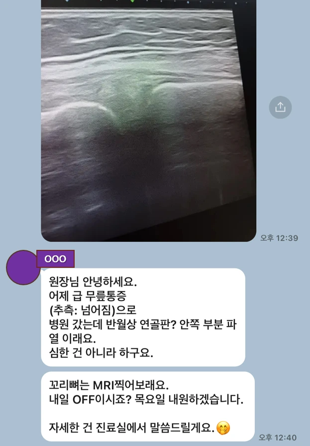 어제 급 무릎통증 (추측: 넘어짐)으로 병원 갔는데 반월상 연골판? 안쪽 부분 파열이래요.