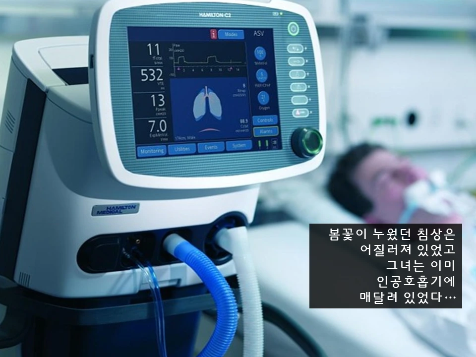 그 날 부터 나는 졸지에 인공호흡기와 씨름을 해야 했다. 호흡 재활 파트에 있긴 하지만 좀처럼 잘 없는 경우라서 나로서는 생소했는데 과장님과 내과 전공의들의 도움을 받아가며 봄꽃을 돌보게 되었다. 하루 업무 시간의 3분의 1정도를 중환자실에서 하게 되었다. 정말 어려운 싸움이었다. 손톱 끝을 볼펜으로 꾹 눌러 보아도 반응이 없었다. 동공반사도 없었다. 심장만 살아 있어서 맥박이나 혈압은 유지되지만 뇌는 영영 돌아올 수 없는 강을 건넌 것이다.
