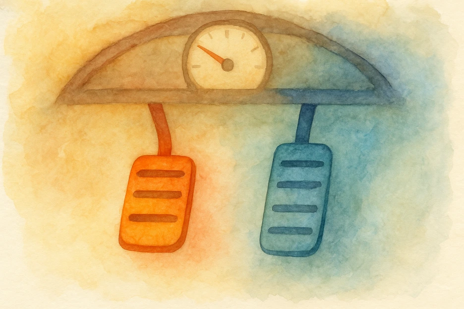우리 몸을 자율주행 차량이라고 보면 두 페달이 있습니다. 교감신경은 액셀, 부교감신경은 브레이크라고 할 수 있죠. 액셀은 도전과 위기에서 속도를 올리고, 브레이크는 휴식과 회복을 위해 속도를 줄입니다.