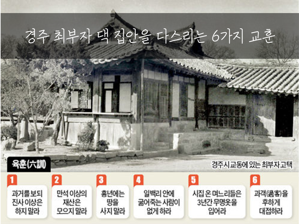 예전 만석지기 경주의 최부자 댁에는 아래와 같은 집안을 다스리는 교훈이 있었다고 해.