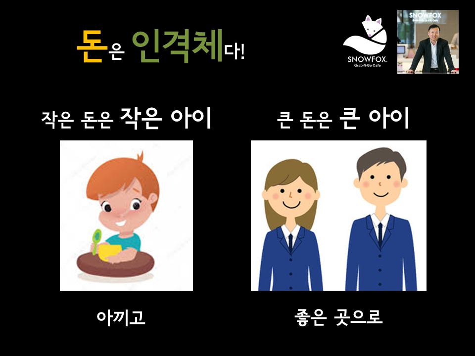 스노우폭스 김승호 회장님의 경우 본인의 노력으로 쌓은 부를 절대로 명분 없는 곳에 쓰지 않고 과도한 친절도 베풀지 않는다. 누군가가 투자를 위해 손을 벌린다 하더라도 절대로 그냥 주는 법이 없어. 그런 면에서는 철저한 이기주의자라고 할 수 있지.