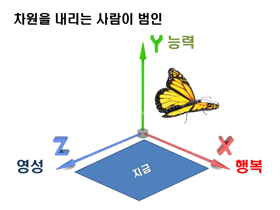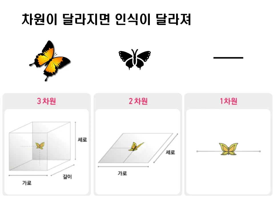 아니, 어쩌면 어려운 정도가 아니라 거의 불가능하다고 보아야 한다. 1차원에서 본 나비의 움직임은 3차원 공간에서의 움직임과는 완전히 다른 왜곡된 움직임이며 나비도 실제 나비인지 단순한 작대기인지 알 수가 없지 않겠니?