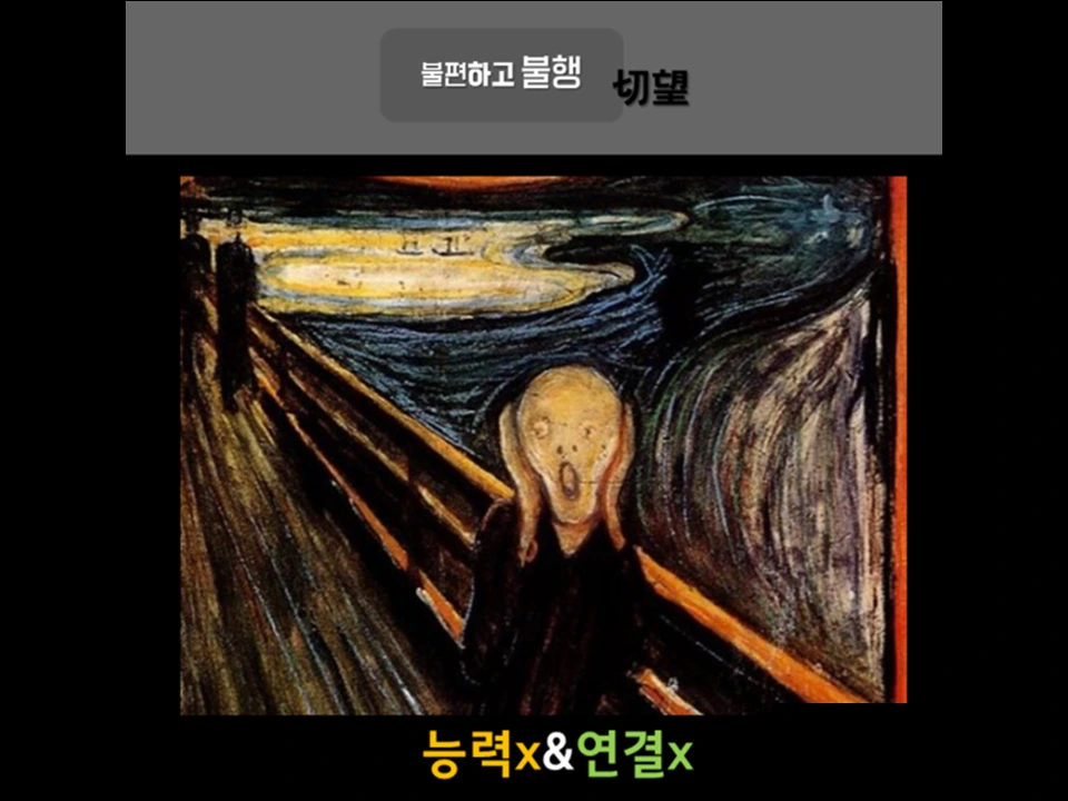 그들은 능력은 없지만 일생을 꼭대기에 오른 사람들을 부러워하며 허덕이다가 인생에게 허락된 가장 소중하고 공평한 자산인 시간을 다 허비하고 만다. 3사분면에 있는 절망적인 사람들이 바로 그들이다. 그들은 능력이 없어 불편하고 연결되지 않아 불행하단다.