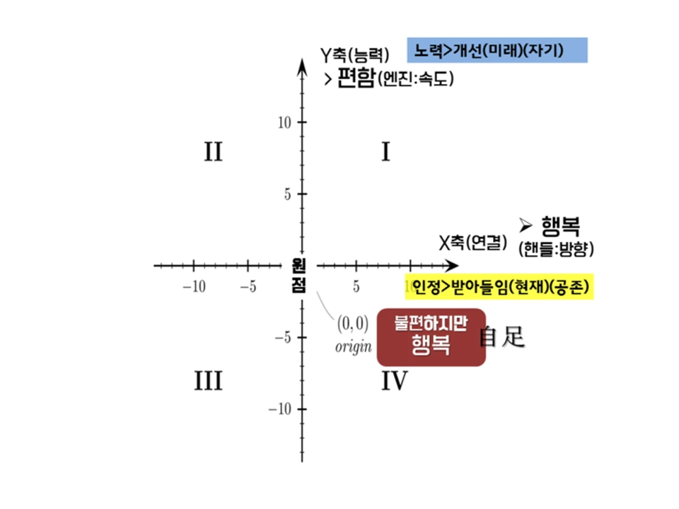 비록 능력은 없어도 다른 사람들과 연결되어 있고 무한한 지혜와 연결되어 만족할 줄 아는 사람들이지. 하지만 스스로 족한 줄을 아는 사람도 멋지긴 하지만 누구에게나 권할 만큼 쉬운 일도 아니란다. '나는 자연인이다'라는 프로에 나오는 분들을 보면 가끔 누구에게도 구속되지 않고 자신만의 삶을 담담하게 만족하며 사는 사람들이 있던데 그런 분들이 4 사분면의 불편하지만 행복한 분들이 아닐까 싶어.