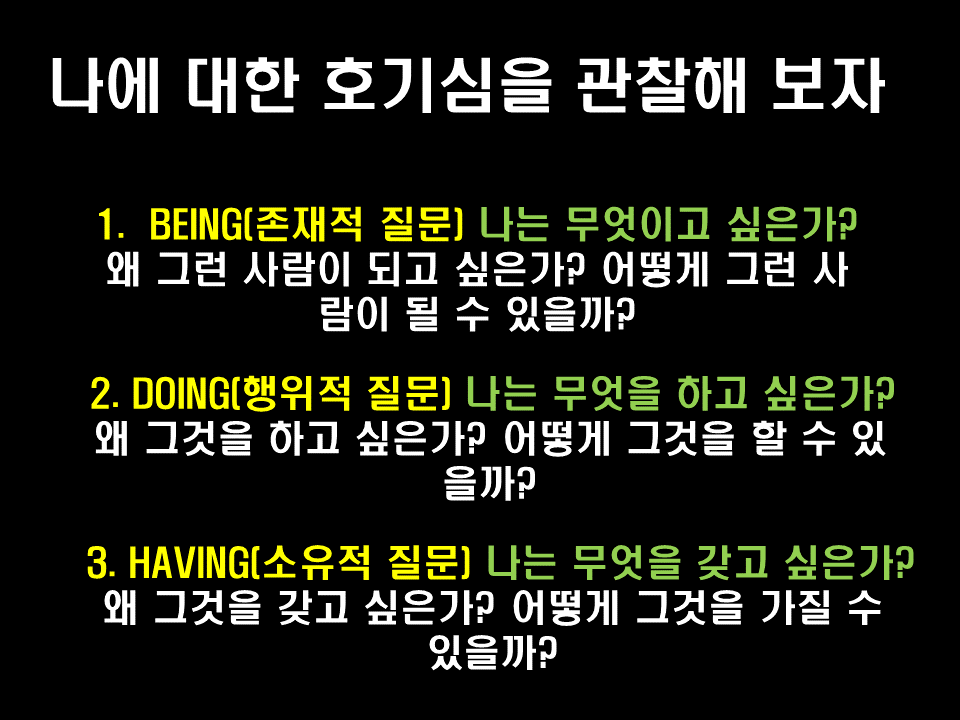 1. Being(존재적 질문) 너는 어떤 사람이고 싶은지? 왜 그런 사람이 되고 싶은지? 어떻게 그런 사람이 될 수 있을지?