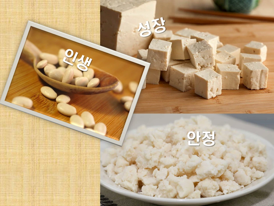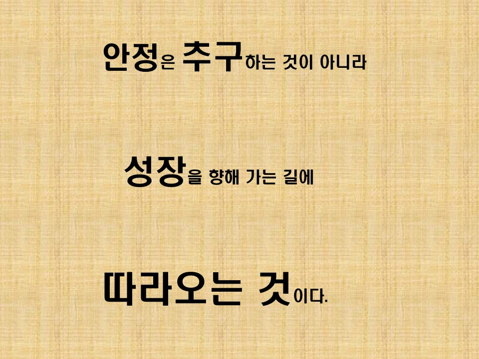 마치 콩으로 두부를 만들면 비지가 생기는 것처럼 시간을 인생이라는 맷돌에 넣어서 돌린다고 치면 성장하고 인격적으로 성숙한 결과물이 두부라면 안정은 그에 따른 부산물처럼 따라오는 셈이지.