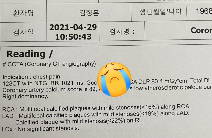 아래는 제 심장혈관 CT 결과입니다. 예상대로 심장혈관이 괜찮을 리가 없었습니다. ㅠ.ㅠ