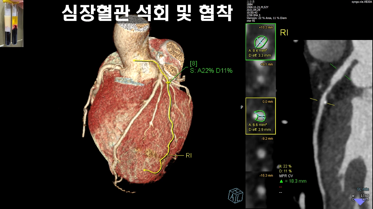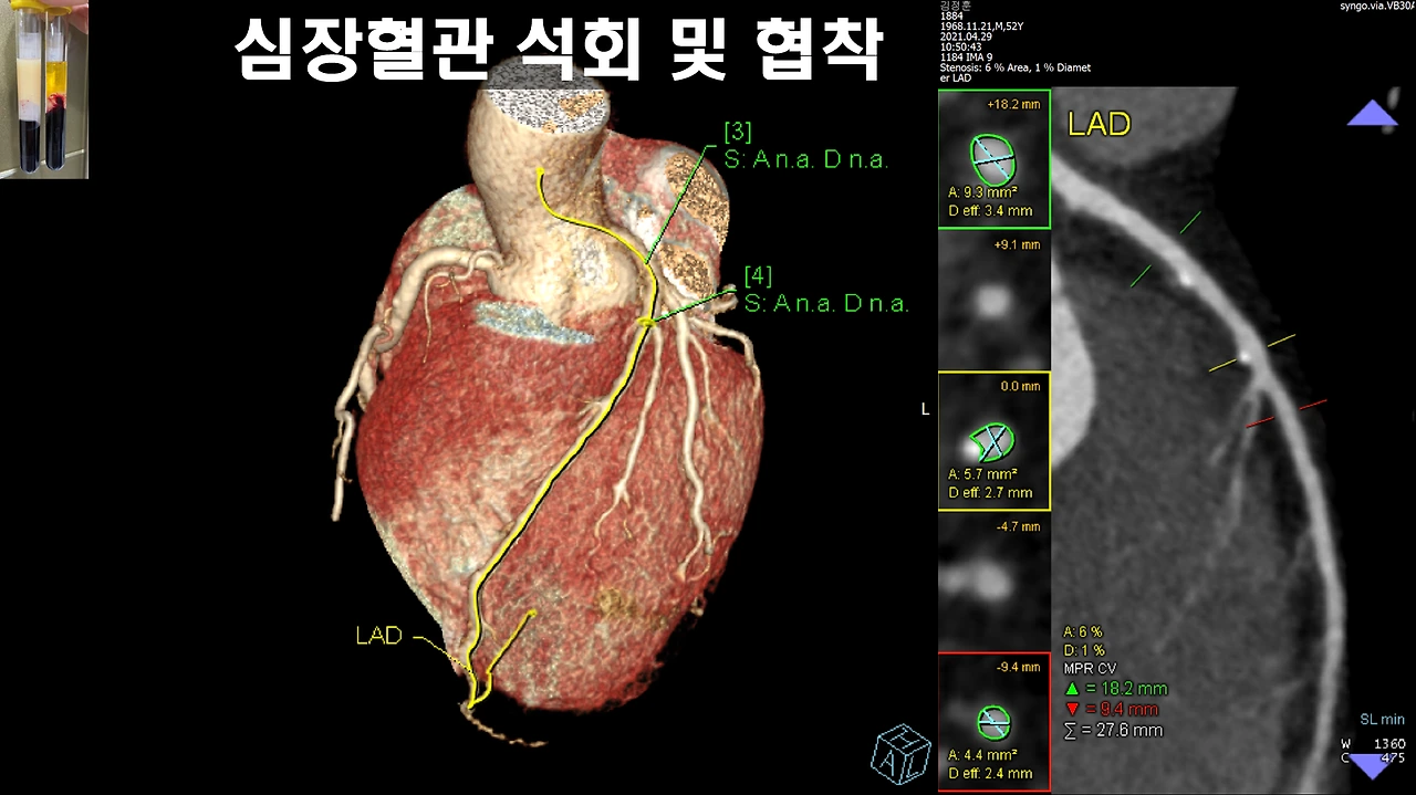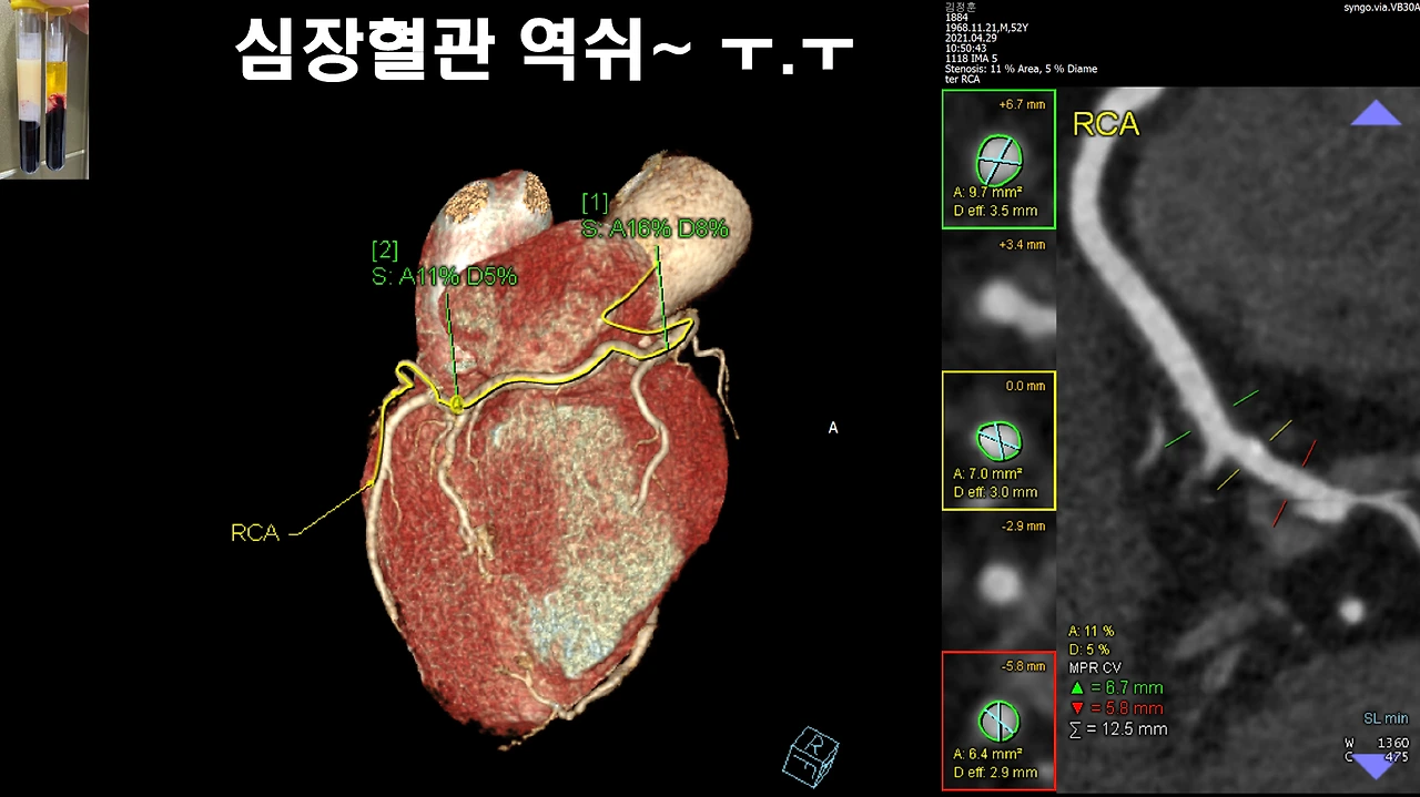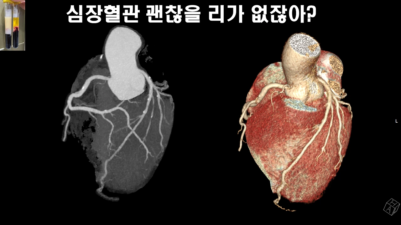 그래서 저는 심장혈관 조영술을 대신하여 CT로 심장혈관이 좁아졌는지, 석회화는 얼마나 진행되었는지 확인하는 검사를 하기로 했습니다.