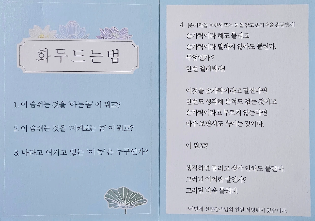 초기 불교의 수행방법이 나의 인식상태를 바라보는 것이라면, 간화선에서 말하는 화두를 결합해서 이를테면 '숨 쉬는 것을 아는 이 놈은 뭐고'