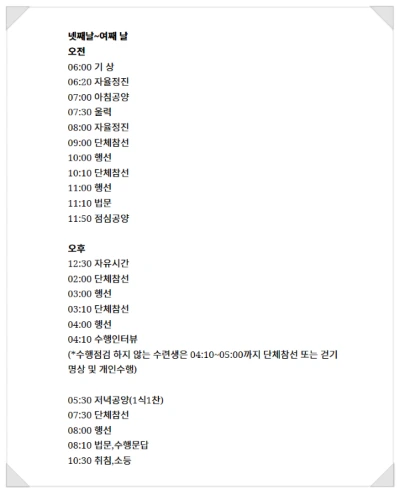 오늘부터는 일정에 각산스님과의 수행인터뷰가 포함이다. 10여 명 정도 팀을 나눠서, 스님과 명상수행 과정에 대해 이야기 나누는 시간을 가졌다. 묵언수행 때문에 명상할 때뿐만 아니라 밥 먹을 때도, 쉴 때도, 말하는 것을 자제했는데, 드디어 입 뗄 수 있는 기회다.