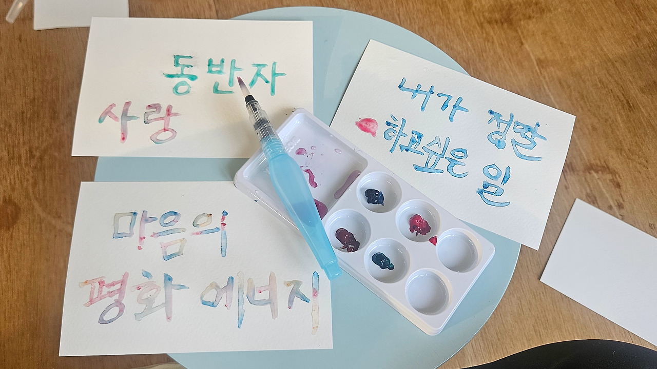 이런저런 생각을 하며, 투명한 물로 글씨를 쓰고, 빨강, 파랑, 초록 물감들을 조금씩 떨어뜨려보기도 했다. 물감이 번지듯, 나의 화두들도 마음에 번진다.