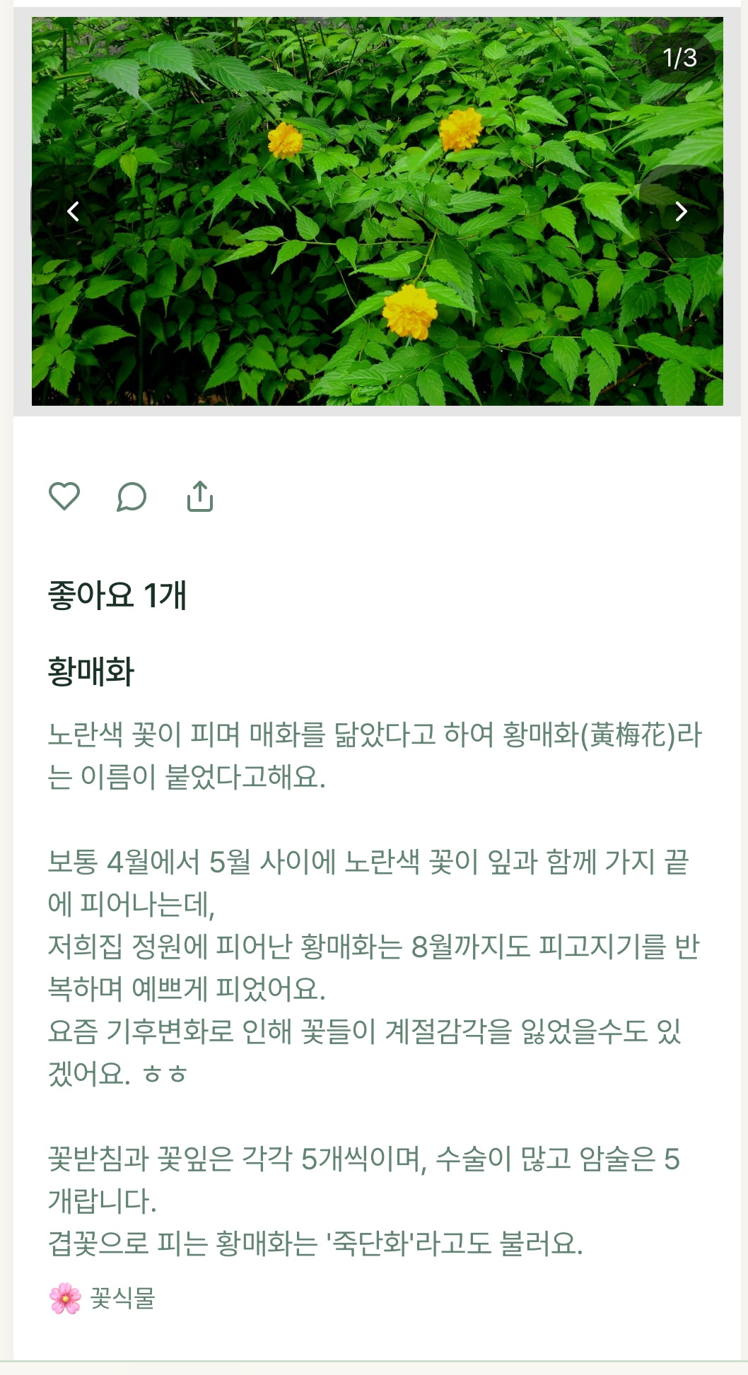 황매화(黃梅花, *Kerria japonica*)는 장미과에 속하는 유일무이한 1속 1종의 단형식물로, 4월 말부터 5월 초까지 피어나는 황금빛 꽃으로 한국의 봄을 장식하는 대표적인 자생 관목입니다. “숭고함”과 “기다림”이라는 꽃말을 가진 황매화는 계룡산 갑사를 중심으로 전국 최대 군락지를 형성하며, 매년 수만 명의 관광객이 찾는 봄꽃 명소로 자리잡고 있습니다. 겨울에도 푸른 줄기를 유지하는 독특한 특성과 강한 적응력으로 도시 조경에도 널리 활용되고 있습니다.