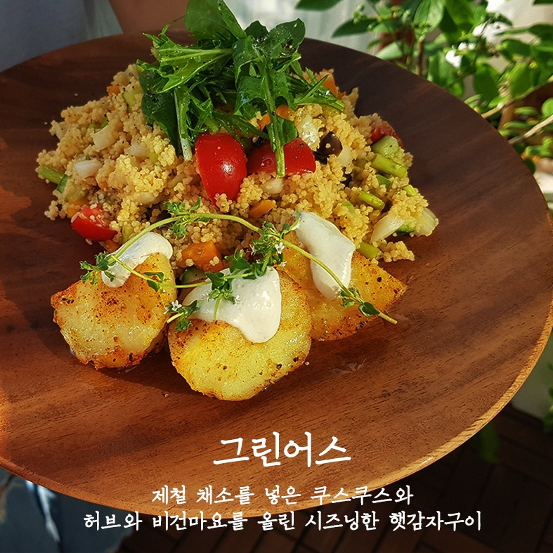 판매 아이템: 제철 채소를 넣은 쿠스쿠스와 허브와 비건마요를 올린 시즈닝 햇감자 구이