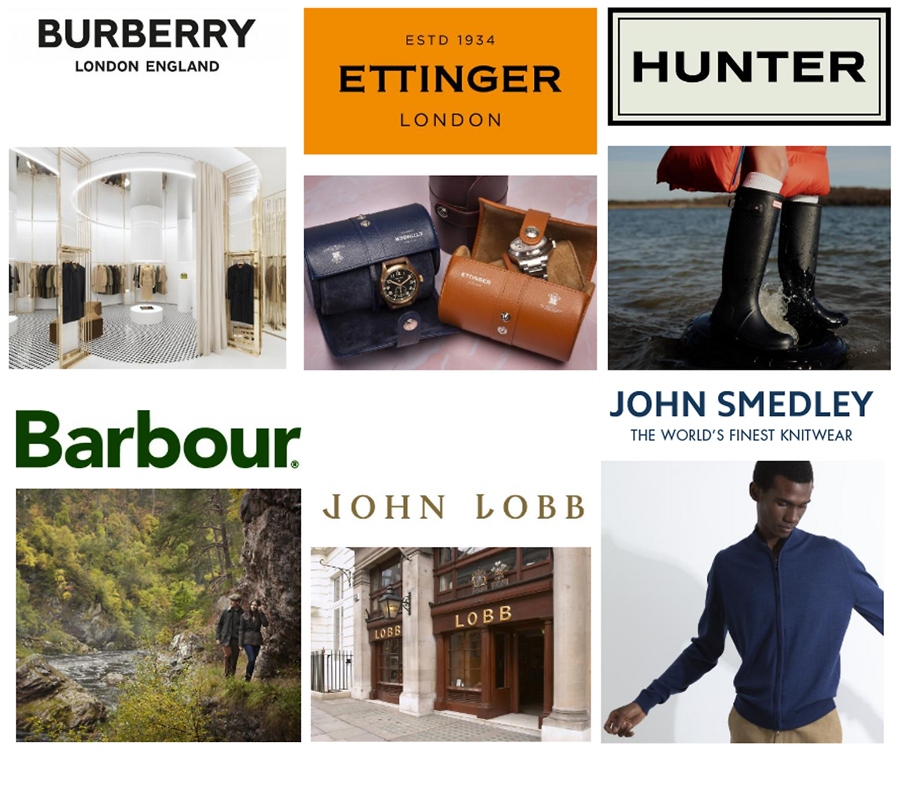 위에서 시계 방향으로 버버리, 에팅어, 헌터, 바버, 존 롭, 존 스메들리