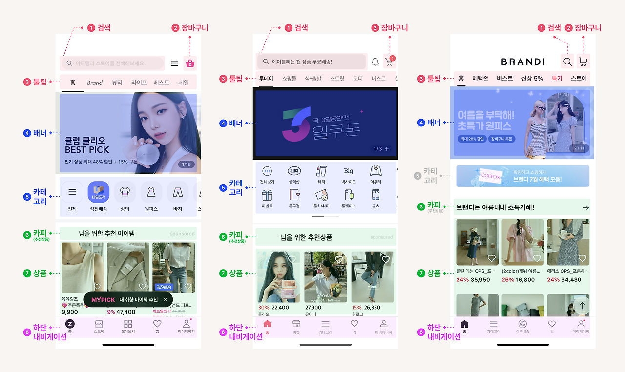 3개의 앱은 서로 다른 브랜드지만 비슷한 구성과 UI를 가지고 있습니다. 특히 지그재그와 에이블리는 메인의 구성이 매우 흡사합니다.