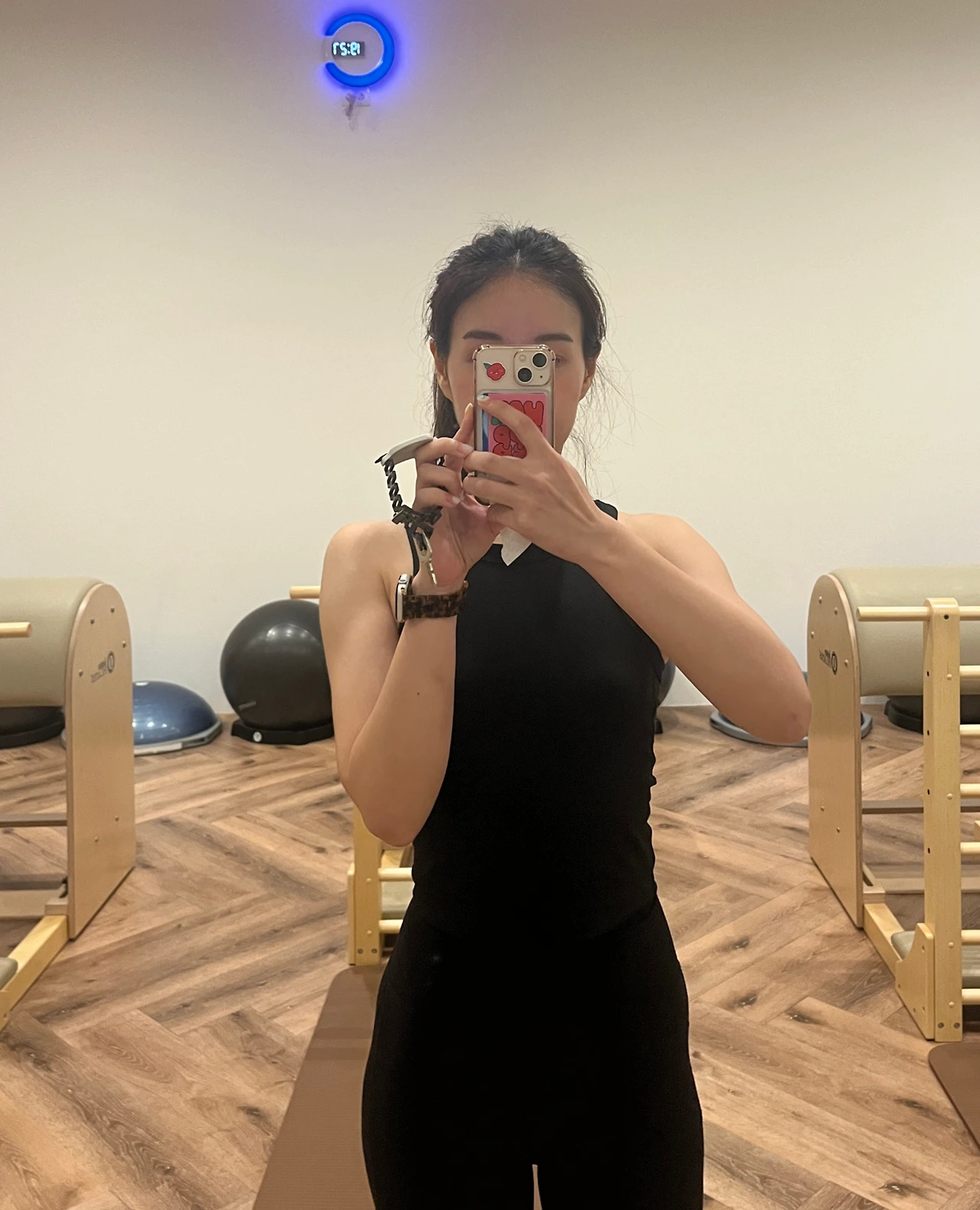 2017년 1월, 첫 필라테스 수업 후 2달이 넘도록 히트텍과 길어서 쭈글쭈글한 레깅스를 입고 운동하던 나의 모습과 2024년 8월, 7년 뒤 오랜만의 필라테스 수업 후.