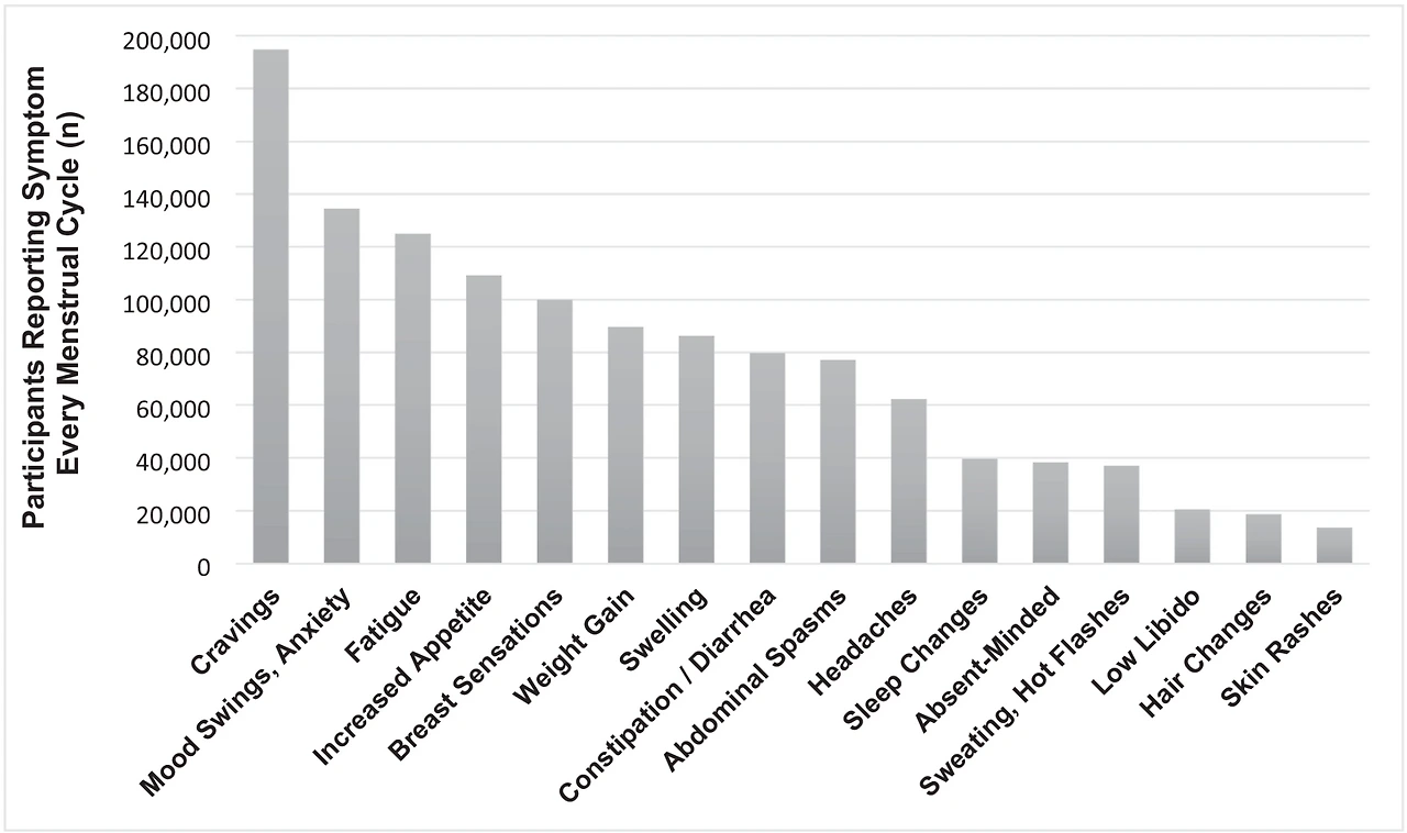 한 국제 연구에서는 Flo 앱을 사용하는 18~55세 여성 238,114명을 대상으로 생리 전 증상을 조사했어요. 그 결과, 가장 흔하게 보고된 TOP 증상은