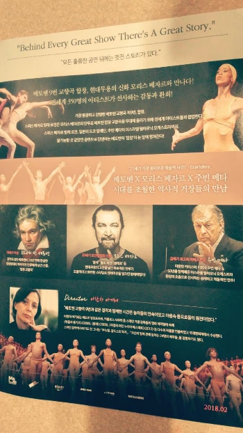퇴근길, 합정에서 잠시 망설이다 목동 메가박스까지 가서 무용 다큐 <댄싱 베토벤>을 봤다. 더 미루었다간 스크린으로 보기 어려워 보였다. 개봉 2주만에 극장에서 거의 자취를 감추었다. 제천국제음악영화제에 소개되었고, 지난해 연말 제1회 서울무용영화제 폐막작이기도 했다. 모리스 베자르 로잔 발레단과 도쿄 발레단(그리고 주빈 메타의 이스라엘 필하모닉)이 함께한 베토벤 9번 교향곡 <합창> 도쿄 공연 제작과정을 담았다.