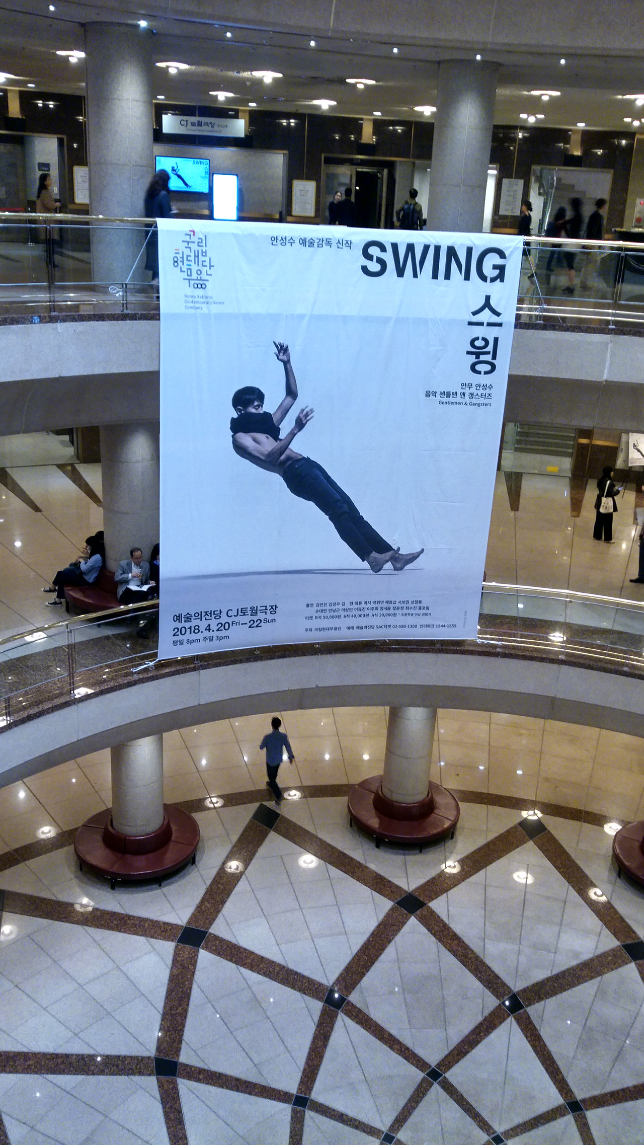 일찌감치 전석 매진을 기록했다니 사실 놀라웠다. 국립현대무용단 공연은 늘 인기가 있지만, 안성수 안무가가 예술감독으로 부임한 이후 부쩍 대중적인 기획이 늘었다. 제목이 '스윙'이라니 재미 없기도 힘들지 않을까. 뒤에 관객과의 대화에서 질문한 분들 보니 스윙 애호가들이 많이 보러 온 듯했다. 스웨덴 밴드 젠틀맨 앤 갱스터즈(한국에 이미 여러번 왔었다고)팬인 관객들도 있었다.
