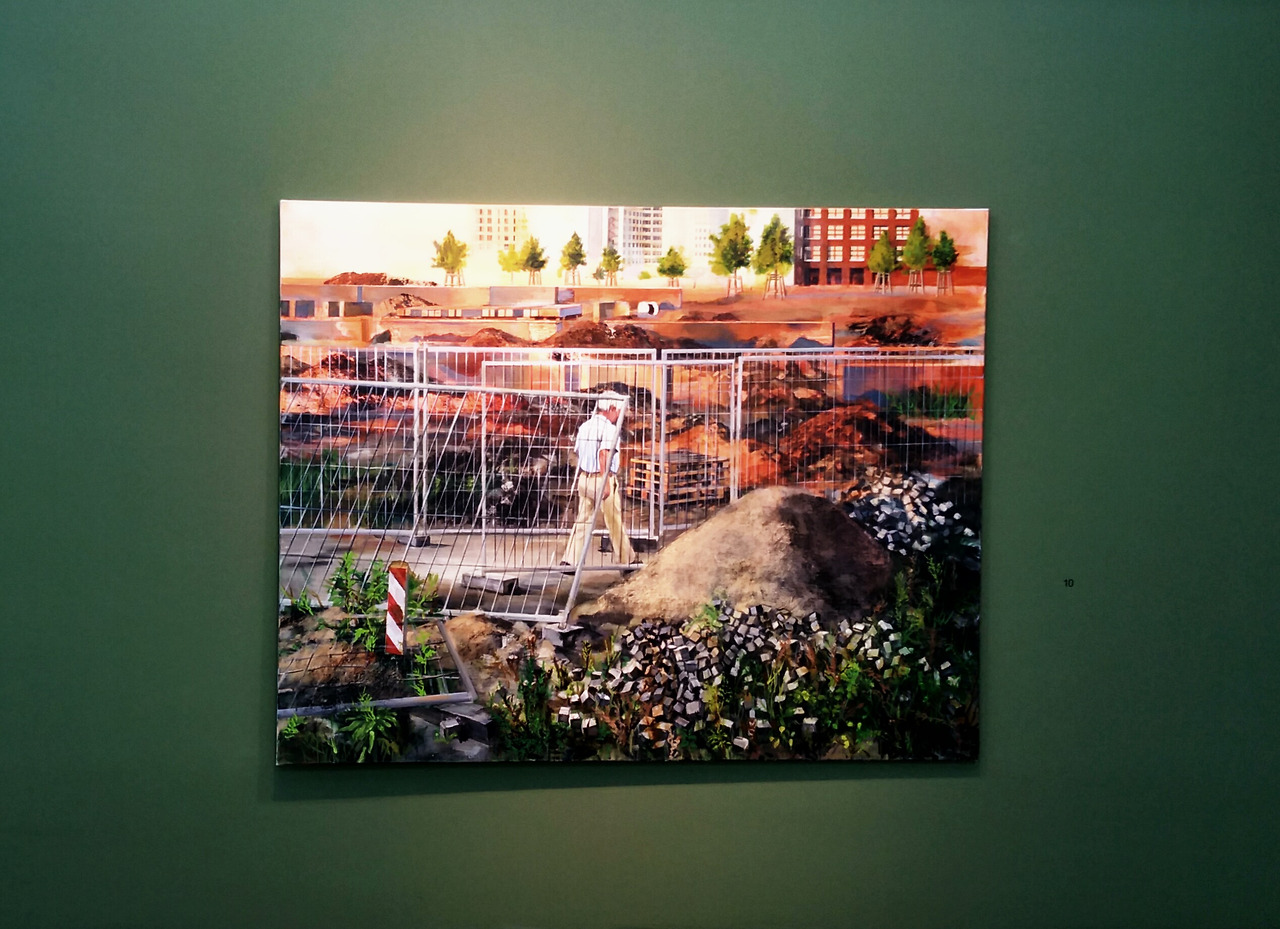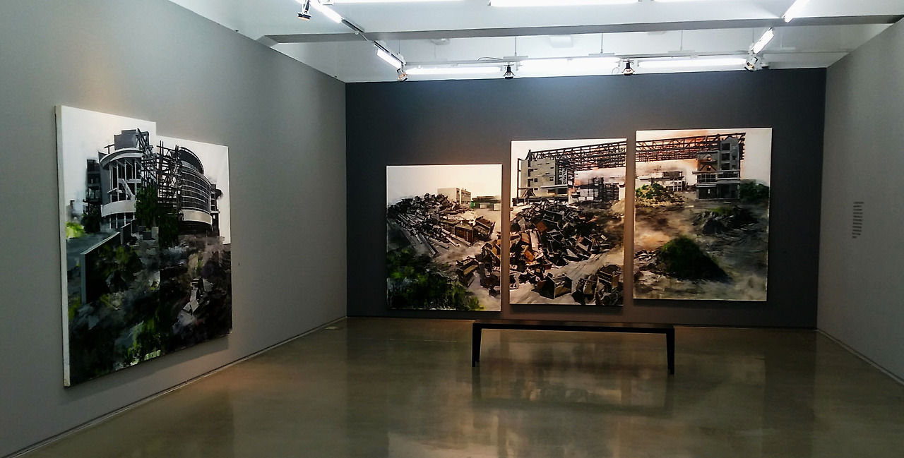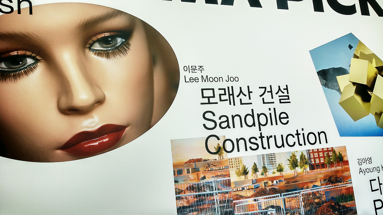 2층 이문주의 <모래산 건설>은 디트로이트 베를린 서울 등을 배경으로 한 도시 사회학적 회화 작업이다. 파괴/건설, 폐허/자연이 오버랩되고 콜라주되어 병치된다. 실제 작업에 참고한 책과 자료도 일부 함께 전시된다 독일 배경인 <공화국궁전과 오투월드>(한쪽은 철거되고 한쪽은 건설되는)의 잔상이 오래 남는다.