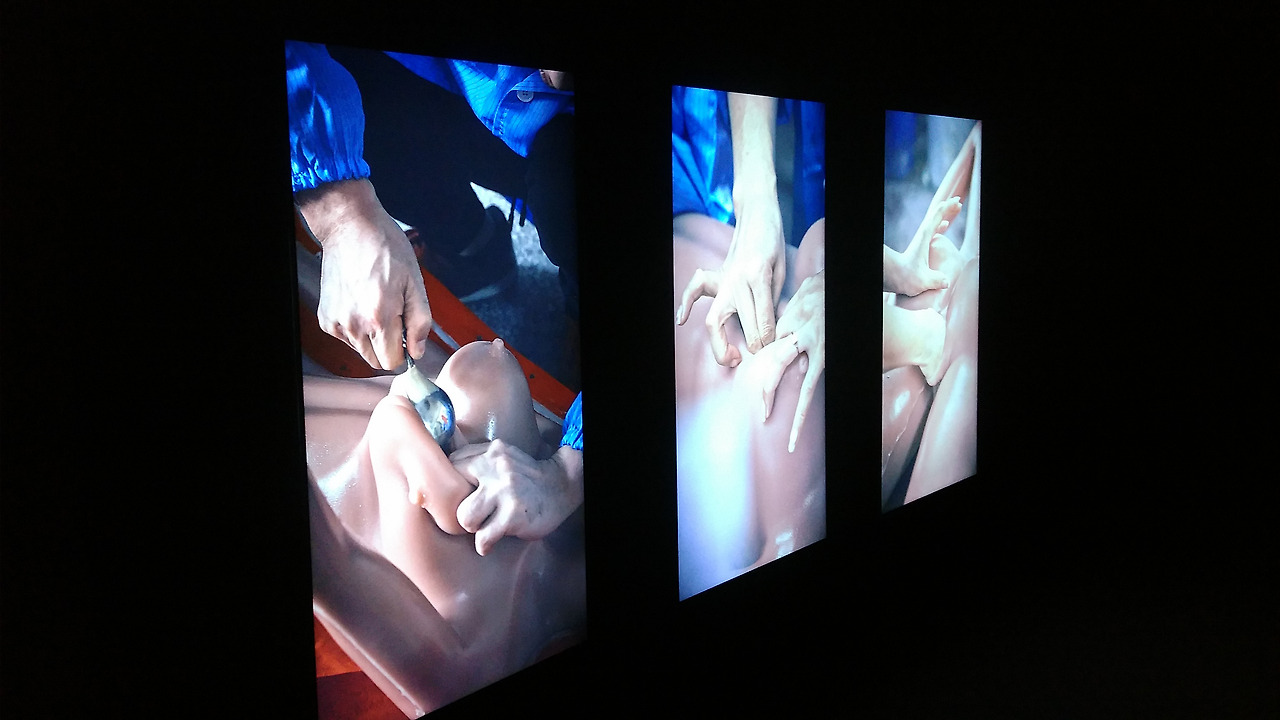 3층 정윤석의 <눈썹>은 중국의 섹스돌 공장의 제조 공정을 담은 다큐와 마네킹 사진-좀 끔찍한- 등이다. 인체를 실제보다 더 실제스럽게 제조하는 모습 자체가 충격적이다. 손과 뜨겁게 데운 막대로 가슴과 성기 쪽을 집중적으로 두드리고 연마해 질감과 촉감, 탄력을 살려낸다. 일본 만화에 나오는 메텔이나 레이 같은 캐릭터, 영화 <에이리언>의 안드로이드가 생각난다.