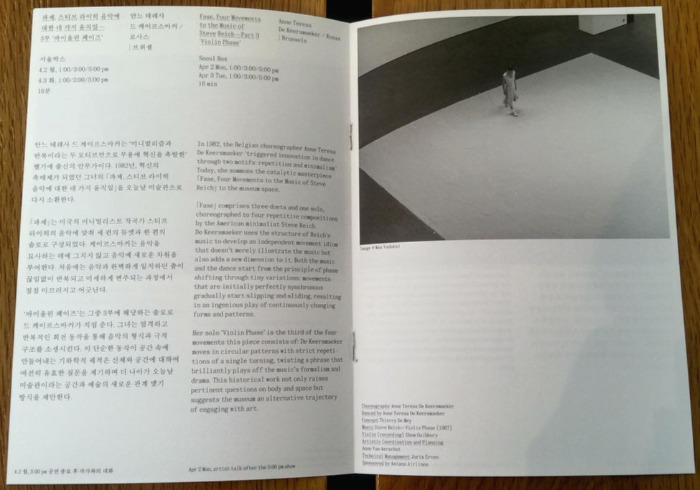 컨템포러리 무용의 중심지인 벨기에를 대표하는 무용단 중 하나가 안느 테레사가 이끄는 로사스 무용단이다. 36년 전 무대를 한국까지 와서 직접 재현하다니 의외이고, 이 16분짜리 공연을 보겠다고 이삼백 명이 찾아오다니 놀랍다. 국립현대미술관 서울관의 다원예술프로젝트는 매달 하나꼴로 프로그램이 잡혀 있다. 예술감독이 누군가 보니 역시 김성희. 모다페, 페스티벌 봄을 기획하고 국립아시아문화전당 예술극장 감독으로 개관공연 라인업을 짰던 이다.