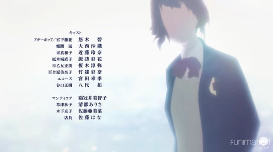 하나의 사건을 다양한 주인공/관찰자들의 관점에서 반복 서술하는 다중 시점 방식의 스토리텔링이 이런 몽환적이고 포근한 분위기를 배가시키고 있다. 덕분에 일반적인 미스터리 스릴러가 발산하는 공포나 긴장이 완화되는 효과가 발생한다. (세계의 위기가 발생했다는데도 '어떡하지?'라는 마음이 별로 들지 않는다. 게다가 애초에 무적 포스를 풍기는 부기팝의 존재가 극적 긴장감을 떨어뜨리기도 한다.) 대신 등장인물들의 동기를 부분적으로 은폐하고 대사를 어긋나게 구성함으로써 관객의 이해를 의도적으로 방해하고 있다. 즉 표면적인 사건의 전말은 드러나지만 그 심층의 심리적 진실에 대해서는 친절한 설명을 회피하는 것이다. 그래서 사건이 종결되고 난 뒤에도 관객들은 찜찜한 기분을 떨칠 수 없고 '근데 왜 그런 거지?'라는 질문을 스스로에게 반복적으로 던지게 된다.