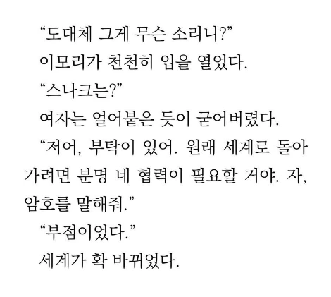그래도 전작을 재미있게 봤다면 팬심으로 읽을 만한 작품이야. 이게 약간 <거울나라의 앨리스> 같은 느낌이 있다. 등장인물이나 핵심 사건들이 거대한 기계 장치의 부품처럼 딱딱 들어맞는 느낌. 근데 그게 개연성이 높다기보다는 자체적으로 설정한 문법/규칙을 치밀하게 지킨다는 느낌이다. 그런 면에선 이공계스럽다. 인물들의 대화나 플롯에 논리 퍼즐의 뉘앙스가 짙게 스며있다.