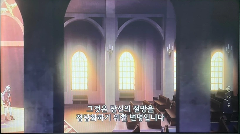 마치 연극 무대를 보는 듯한 구성이다. 레나와 칼슈타르 사이의 간극은 결코 극복할 수 없는 것임을 암시하기 위해 둘을 멀찍이 떨어뜨리는 것으로도 모자라 그들 사이에 큰 기둥을 두 개나 두고 있지 않은가? 게다가 빛과 어둠까지. 교과서적인 연출이다.