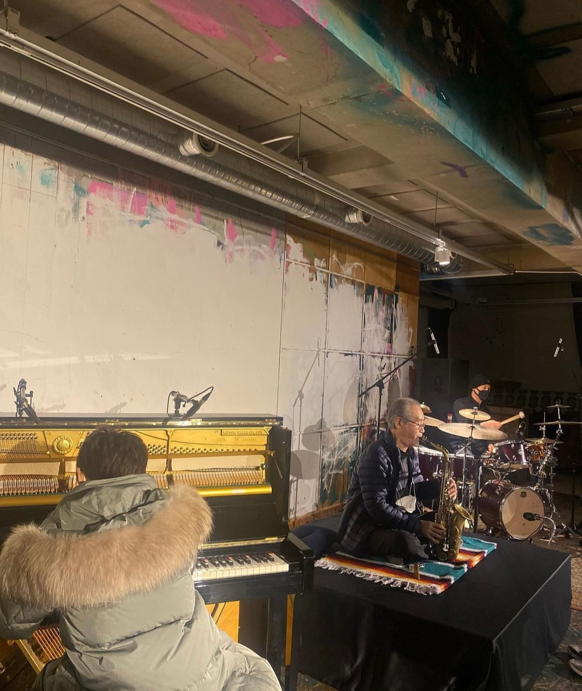 게토 얼라이브의 주인장은 나의 친구인데 공연이 시작되기 전 설레는 시간에 그 친구가 내 옆을 지나가면서 ‘오늘 신세계를 경험하게 될 거야.’ 라는 의미심장한 귓속말을 던지고 갔다. 예측 안되는 음악 공연이라니 게토의 첫 방문일에 경험하기에 괜찮은 선택이었군 생각했다. 잠시 후 70대 정도로 보이는 노장 색스폰 연주자가 중앙에 설치된 좌판에 신발을 벗고 앉으셨고 무용이든 극작가든 화가든 예술가 포스가 물씬 나는 타악기 연주자가 드럼 앞에, 은빛이 돌만큼 밝은 금발의 단발과 찢어진 청바지 등 매무새가 평범치 않은 피아노 연주자가 피아노 의자에 위치하셨다. 세 분이 작은 목소리로 짧은 한담을 나누신 뒤 침묵이 흘렀고 기묘한 색스폰 소리와 함께 공연이 열렸다.