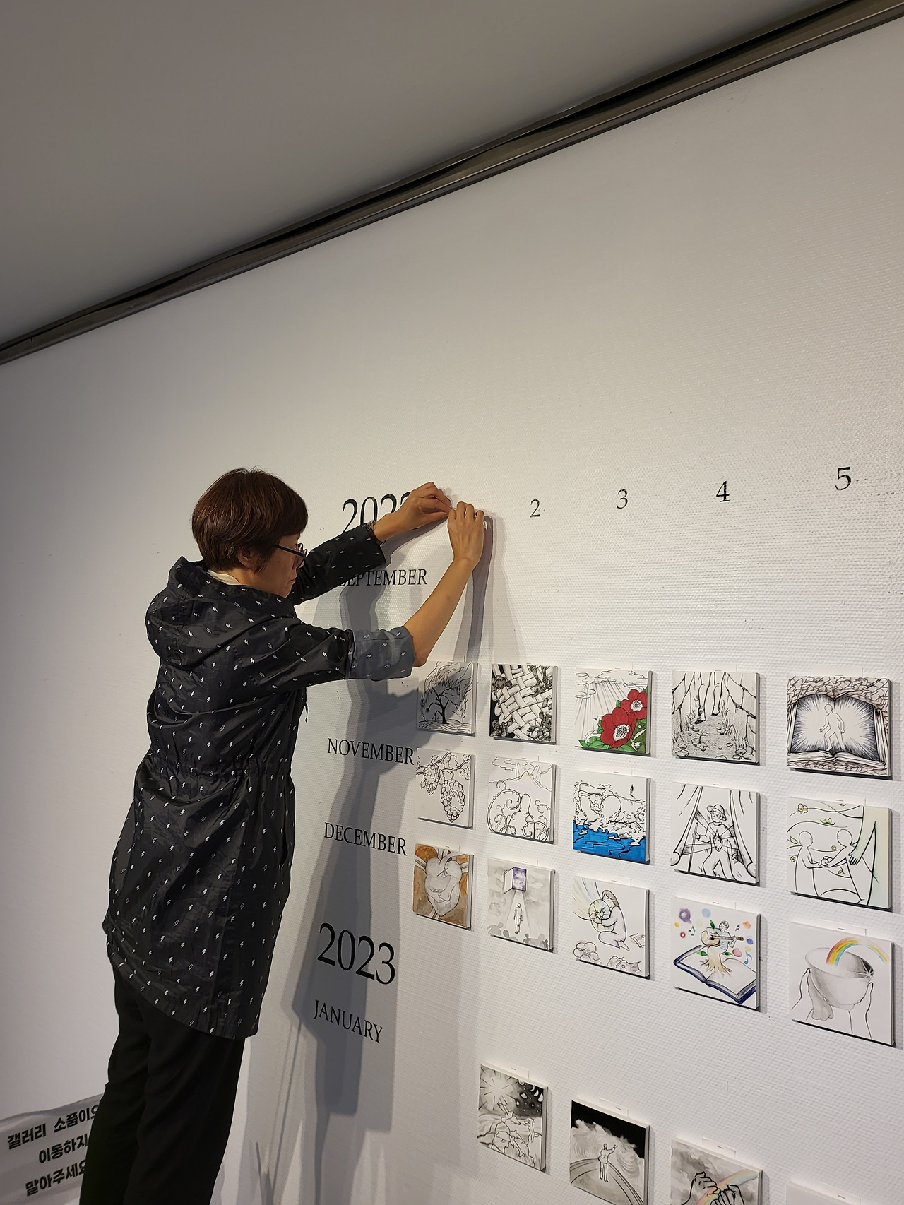 큐레이터님은 300일 프로젝트를 구상, 제안하시고 전시를 기획하신 분이다. 4인의 묵상글을 매일 수집하고 요약한 내용을 2시간의 영상으로 제작하셨고 이 영상 작품은 전시장 초입에 설치한 TV에서 상영되었다. 많은 작품들을 효과적으로 설치하기 위해 달력같은 배치 방식을 고안하여 커팅 시트지 작업을 함으로써 작품들이 가진 장점을 끌어올리셨다. 작업과 전시 준비 과정에서 나의 심신이 지칠 때 폭풍 격려로 힘을 잔뜩 불어넣어주신 분이기도 하다.