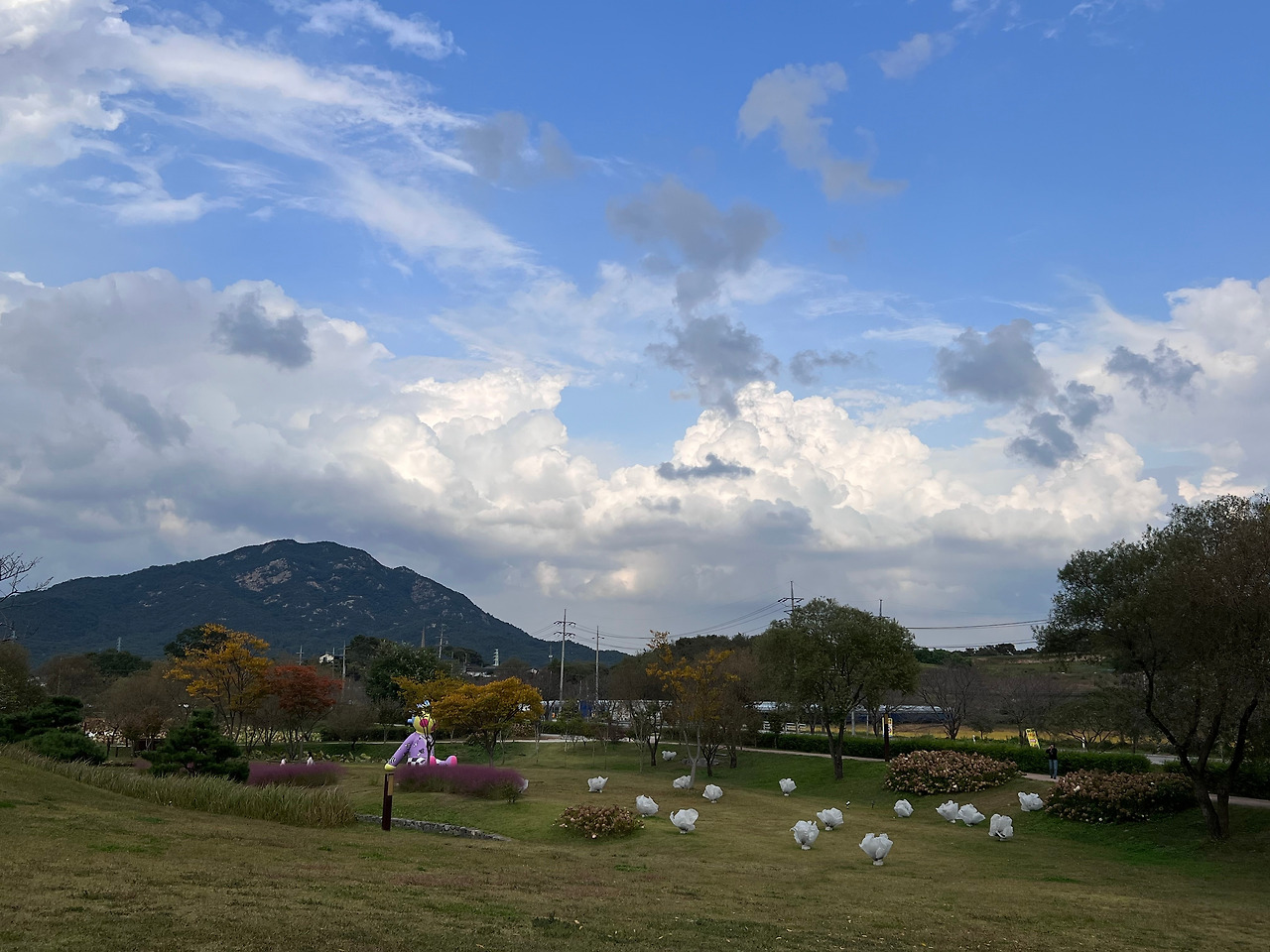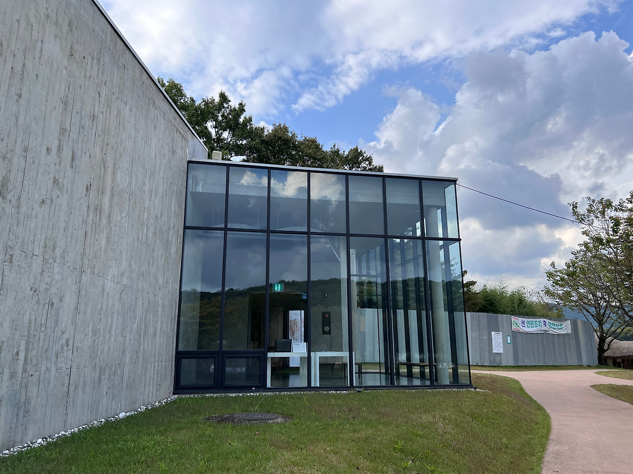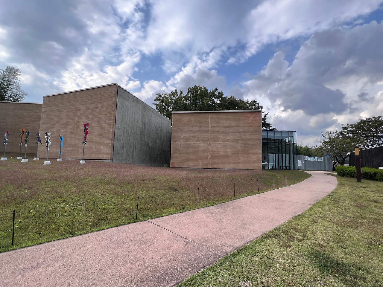 미술관 주차장에서 내려 걸어들어갈 때 가장 먼저 나의 눈길을 사로잡은 것은 세련된 건축 디자인 이전에 주변의 광활한 자연 풍광과 실물로는 처음 접하는 핑크뮬리였다. 미술관 앞 너른 벌판에는 초록의 식물들, 탐스러운 열매가 맺힌 모과 나무, 입체 작품들, 야간을 밝히는 조명 등이 펼쳐져 있고 쨍한 분홍색 핑크 뮬리가 바람에 물결 치듯 흔들리고 있었다. SNS 속 피사체들의 포토존으로 유명하다고 알고 있는 신비로운 식물을 갑작스레 여기서 만나니 반갑기도 하고 황홀하기도 했다. 일렁이는 분홍색 물결 너머에는 조성룡 건축가가 설계한 세련되면서 화려하지 않은 현대적 건축물이 주변 풍광과 조화를 이루며 우릴 기다리고 있었다. 미술관에 들어가기 전부터 이미 가을날 전원 풍광의 아름다움에 흠뻑 빠질 수 있어 뜻밖의 선물을 받는 느낌이었다.
