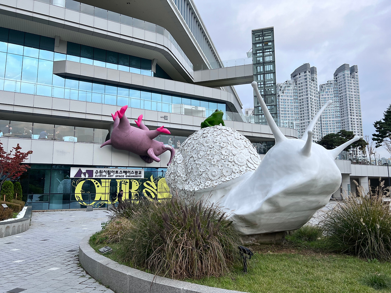 호수를 옆에 두고 빙 둘러 20여 분을 걸어가니 수원 컨벤션센터로 통하는 다리 같은 통로가 나타났고 그 길로 들어서자 최정화 작가의 거대한 달팽이 조각이 관람객을 맞이하는 '아트스페이스 광교'가 보였다.