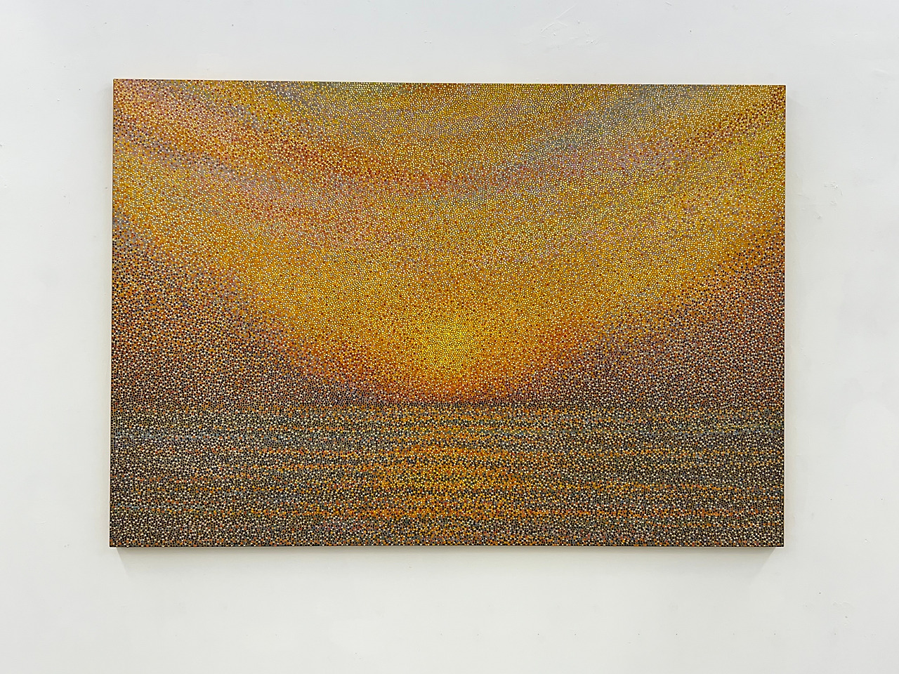 기억 시리즈의 경우 처음에 콩알만한 금색 동그라미로 전면을 채우는 일부터 노동집약적인데 각 점을 다른 색으로 채워 나가면서 색의 관계를 예민하게 살펴야 하니 작업 시간이 오래 걸린다고 한다. 작업 과정의 특성상 100호 정도의 작품 하나를 끝내는데 4개월 정도가 걸린다고 하며 작가가 쏟은 노력과 쌓여진 시간 자체가 작품의 재료라고 할 수 있다. 기억 시리즈 작품들은 볼 때마다 미묘하게 달라지는 색상으로 인해 신비로운 감정을 느끼게 했는데 특히 <기억-은혜의 빛>이라는 100호 작품에 그려진 일출 장면은 나의 시선을 오래 끌어 당겼다. 일출이 주는 감동은 언제든 무심하게 지나칠 수 없는 것이며 당시 작가가 보았던 그 빛은 어땠을까 궁금했다.