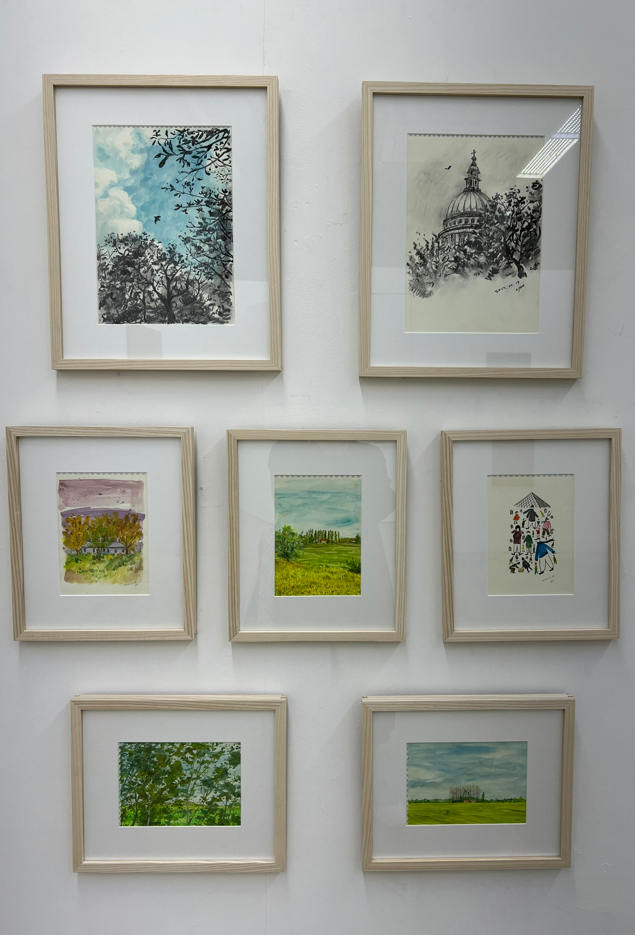작가가 런던 개인전때문에 유럽을 갔을 때 했다는 풍경 스케치도 좋았는데 제일 위의 목탄으로 그린듯한 스케치는 5분, 두세번째 줄의 수채 스케치는 각각 10분씩 시간 제한을 두고 집중해서 그린 것이라고 했다. 스케치 작품으로서의 완성도, 붓터치, 세부 묘사가 모두 뛰어나 그렇게 짧은 시간 안에 완성했다는 사실이 놀랍기만 했다. 나도 틈틈이 스케치와 크로키를 하고 있는데 이내 작가의 속도를 절대 못 따라갈 듯 하지만, 그래도 포기하지 말고 작품 완성도와 속도 모두 다 잡아야 겠다는 남모를 결심을 했다. 두번째 줄 오른쪽의 스케치도 재미있었는데 프랑스 파리에 갔을 때 날이 추워 시민들이 각기 다른 방한복, 모자 등을 착용한 모습을 관찰하고 그린 뒤 한 화면에 모았다고 했다. 여행을 가게 되면 그 곳 사람들의 모습을 관찰해 이런 귀여운 일러스트레이션을 만들어보는 경험을 해보고 싶어졌다.