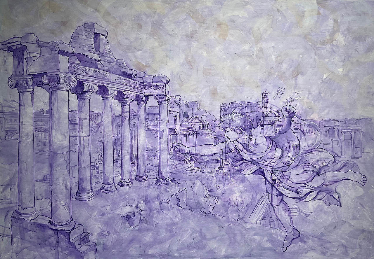 달려가고 있는 천사의 환영은 사라진 과거 용맹스러운 제국의 역사를 몸으로 표현하듯 강한 에너지를 뿜고 있으며, 여성의 환영은 고대의 아름다운 도시가 무너져 돌무더기가 된 모습을 애도하는 듯 꽃잎을 떨구는 꽃 한 송이를 든 채 거닐고 있다.
