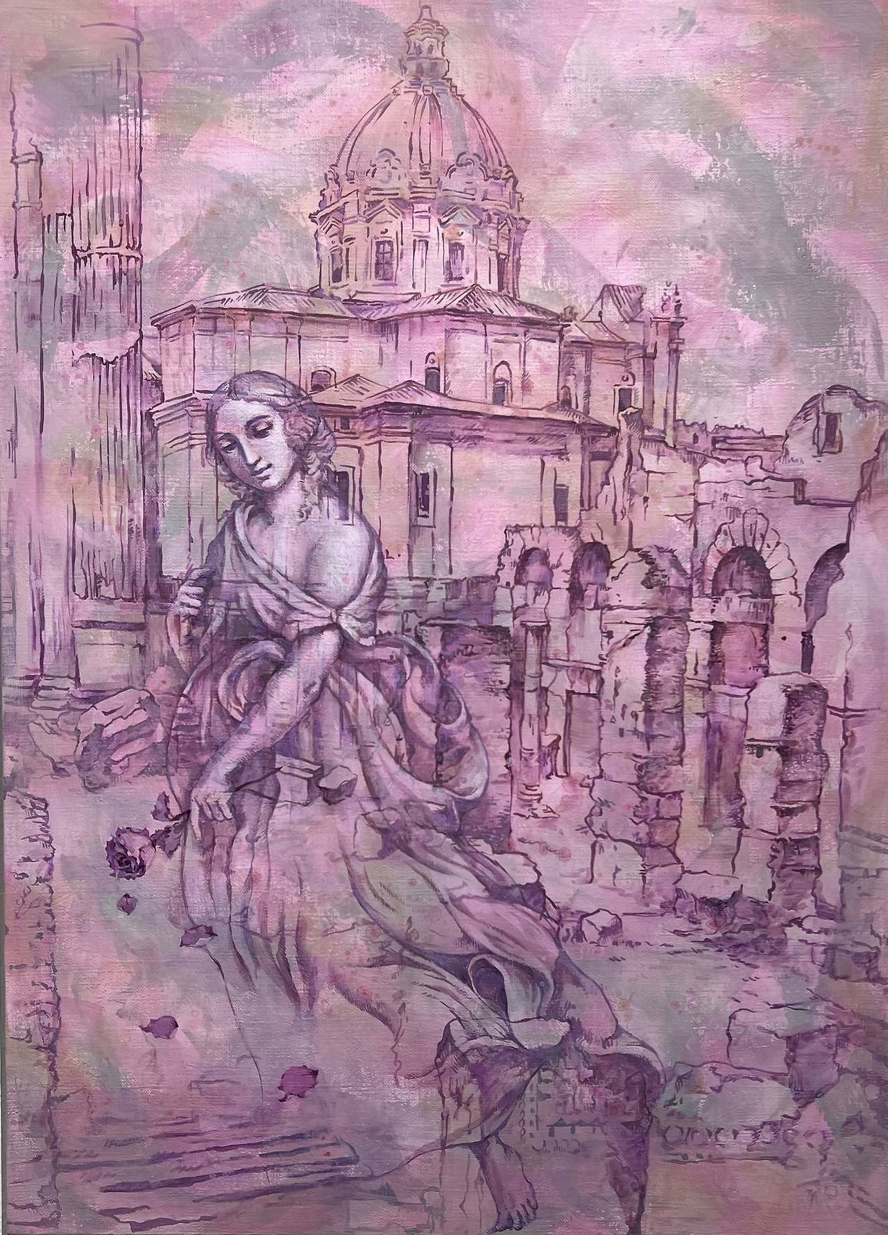 낡고 헤져 거칠어진 돌들의 표면을 연상시키는 거친 붓 터치의 배경 위에 폐허의 잔해들을 그린 선, 그것들과 오버랩되는 고전 인물들의 모습이 내가 느꼈던 비장미를 조금이나마 반영하는 듯하다. 고대 로마 시대 사라진 도시를 소재로 하여 르네상스 시대 프레스코 인물을 그려넣은 21세기의 아크릴화 두 점이 탄생되었다.