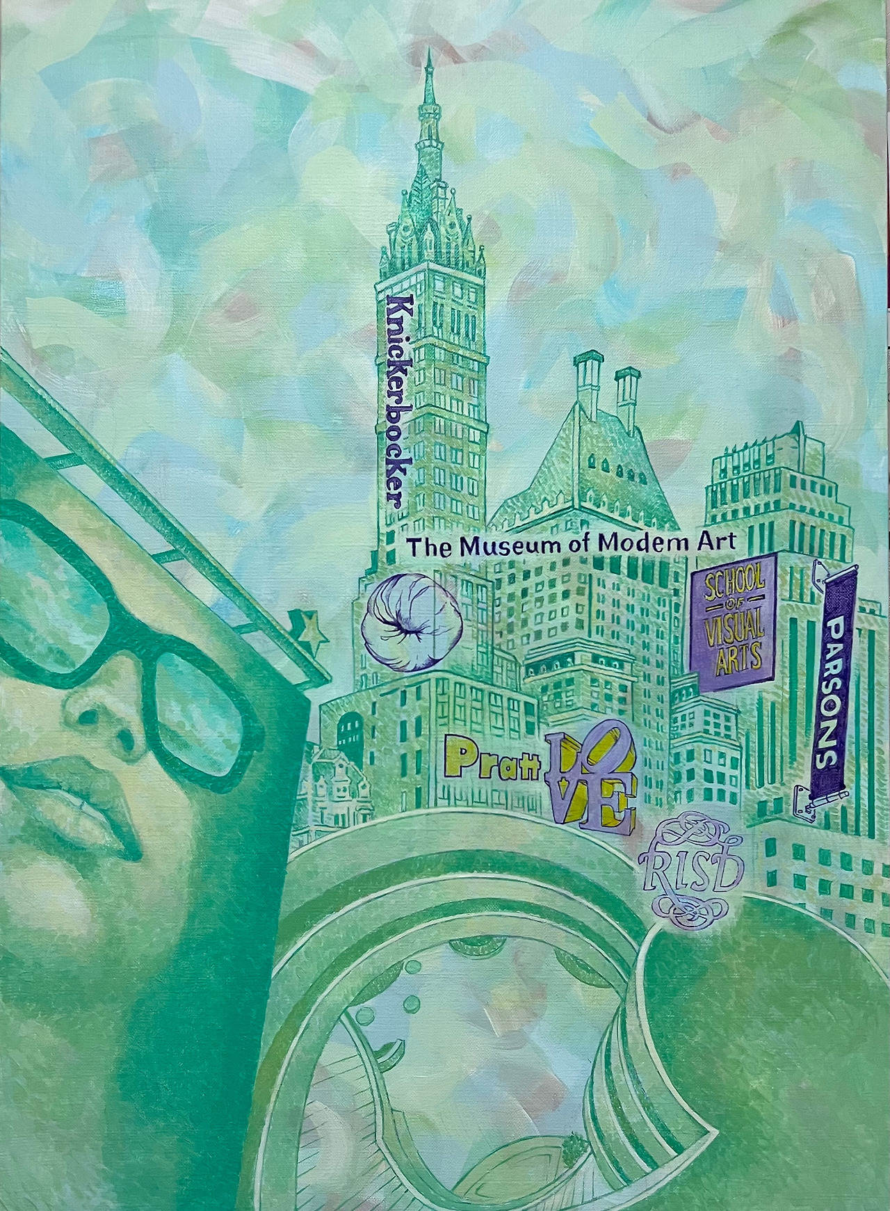 뉴욕 바라기 시절 뉴욕에 가면 하고 싶었던 일, 가고 싶었던 곳들을 센트럴 파크 주변 건물들 위에 수놓듯이 그리며 하나하나 떠올렸다. 만약 유학을 가게 되었다면 프랫, 파슨스, 로드아일랜드, 스쿨오브비주얼아트 등과 같이 주변 사람들을 통해 들어본 대학교를 지망했을 것 같아서 이름들을 넣었다. 미술 잡지에서 보았던 나선형의 뉴욕 구겐하임 갤러리 내부와 뉴욕 현대미술관(MOMA)의 간판도 넣어 보았다. 뉴욕의 대표적 장소인 타임 스퀘어의 광고 전광판 일부와 뉴욕시 공공 조각으로 유명한 로버트 인디애나의 조각 작품 '러브'도 그렸다.