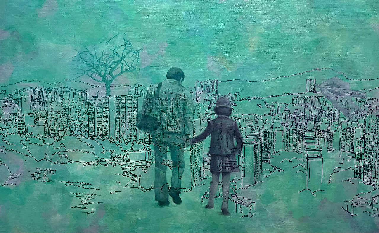 이번에 팔십 다 되신 아버지와의 전시를 준비하면서 아버지의 수채화를 참고로 그리는 그림 외에 두 사람이 사는 동네의 전망을 크게 그린 그림은 어떨까 하는 생각이 들었고 송파구의 아파트가 내가 사는 수지의 아파트로 점차 변화하는 모습을 선으로 묘사하는 작업에 착수했다. 막상 그려보니 아파트라는 것이 다 거기서 거기인지라 중간에 만나는 부분의 이음새를 신경을 쓸 필요 없이 그냥 두 동네가 하나같았다. 60호의 캔버스 위에 두 사람이 사는 아파트가 넓게 펼쳐진 가운데 이 그림 속에 아버지와 나의 뒷모습을 그려보면 괜찮겠다고 생각했는데 어린 시절 해외 출장으로 부재가 많으셨던 아버지와 둘이 찍은, 다정해 보이는 사진을 찾기 어려웠다. 어렵사리 찾은 사진이 경주 여행 때 찍은 이 사진인데 한껏 빼입고 맨발로 걷고 있는 어린 나와 젊은 아빠였던 시절 늘 큰 가방을 메고 다니셨던 아버지 두 사람이 손잡고 걸어가는 뒷모습이 들어 있었다.