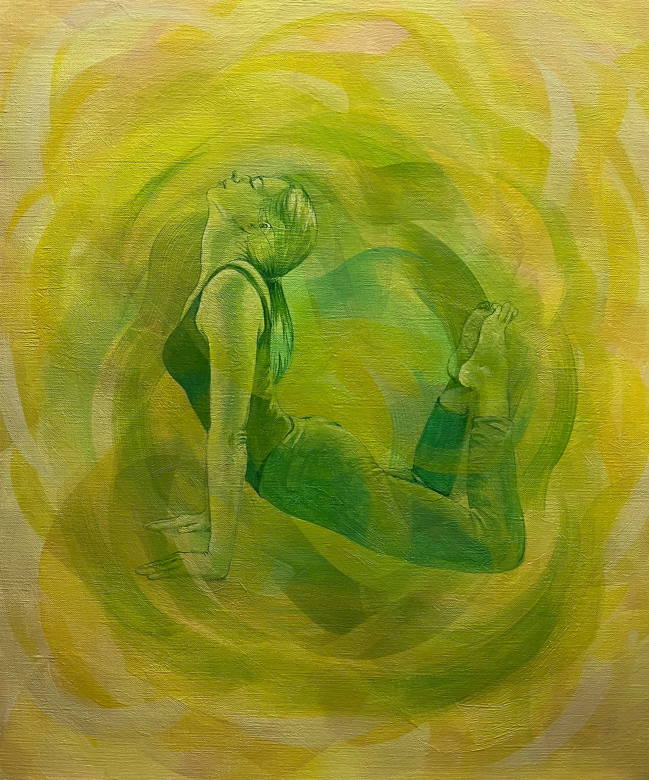 자전거 그림에서 영감을 얻어 운동 관련된 그림을 그리기로 마음먹고 필라테스에 관한 그림을 그리기 위해 내가 다니는 필라테스 센터의 내부를 촬영하고 그것을 배경으로 하여 여러 사람이 필라테스하는 장면을 표현하기 시작했다. 그리는 도중 처음 머릿속에 그렸던 것과 실제로 그리고 있는 작품 간의 간극이 커서 어떻게 진행을 해야 할지 갈피를 잡을 수 없는 상황이 되었다. 몇 번을 수정하다 점점 미궁으로 빠지는 느낌이 들어 전시 오픈 일주일 전에 다른 색으로 완전히 덮어 버렸다. 노란색 바탕 위에 운동으로 인한 기운, 에너지를 상징하는 붓터치들을 넣고 다른 요소들 없이 필라테스 동작을 하는 사람 한 명만 그리기로 구상한 뒤 밑 칠한 바탕 위에 단숨에 이미지를 그려 넣었다. 풍경을 그려야겠다는 고정관념을 없애고 필라테스를 할 때의 느낌 위주로 표현하기로 하니 오히려 편안하게 작업할 수 있었다. 풍경에서 얻은 상상을 소재로 하여 많은 고민과 붓질이 들어간 그림들이 대다수인 이번 전시 작품들 중 드로잉적인 붓질로 간결하게 그린 이 인물화는 색다른 인상을 줄 수 있지 않을까.