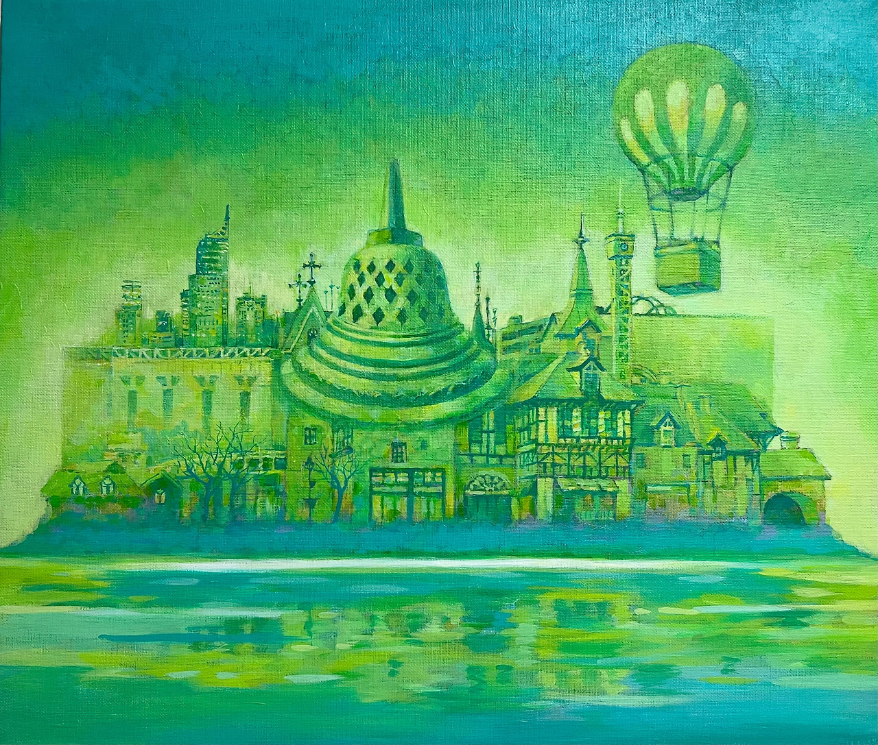 매직 아일랜드 중앙의 노인슈반슈타인성 모양의 구조물 대신 보로부두르 사원의 스투파 형태를 넣었고 하단에는 놀이 공원의 모습을 그대로 담았는데 롯데월드 어드벤처의 상징과도 같은 기구는 원래 실내에 있지만 하늘에 띄웠다. 아이들이 어릴 때 처음으로 롯데월드 어드벤처에 데리고 간 날 아가였던 둘째가 이 기구를 너무 좋아해서 여러 번 탔다. 놀이 공원 안에 기왕 인도네시아의 사원을 그렸으니 인도네시아의 현대적인 요소도 넣어볼까 싶은 생각으로 내가 지냈던 도시인 수도 자카르타의 풍경을 왼쪽 건물 위에 그렸다. 자카르타 살 적에 영어 학원 갈 때 과외하러 갈 때 교회 갈 때 차를 타고 다니면서 숱하게 보았던 만년필 모양의 랜드마크가 뇌리에 남아 있는데 이름이 기억 안나서 검색해보니 베쩨아(BCA) 빌딩이라고 한다. 뾰족한 만년필 촉이 하늘을 향해 서 있는 형상을 하고 있는 건물이다.