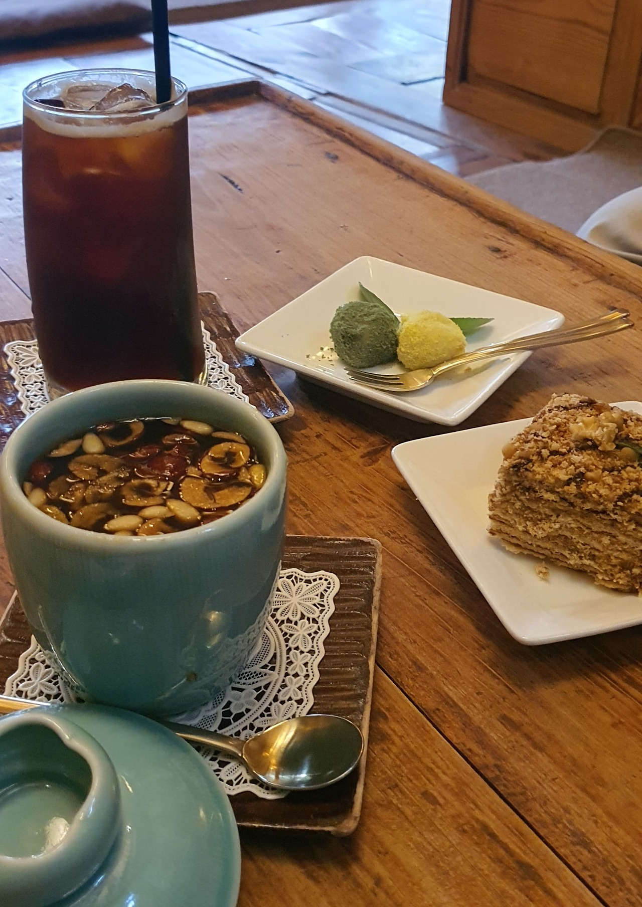 전통찻집이라 쌍화차, 오미자차, 팥죽, 떡 같은 메뉴가 있었는데 나는 전통차, 남편은 커피와 달달한 떡디저트를 시켰다.