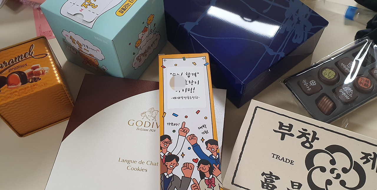 여기저기서 받아오고 보내주신 초콜릿과 찹쌀떡이 쌓여 있다.