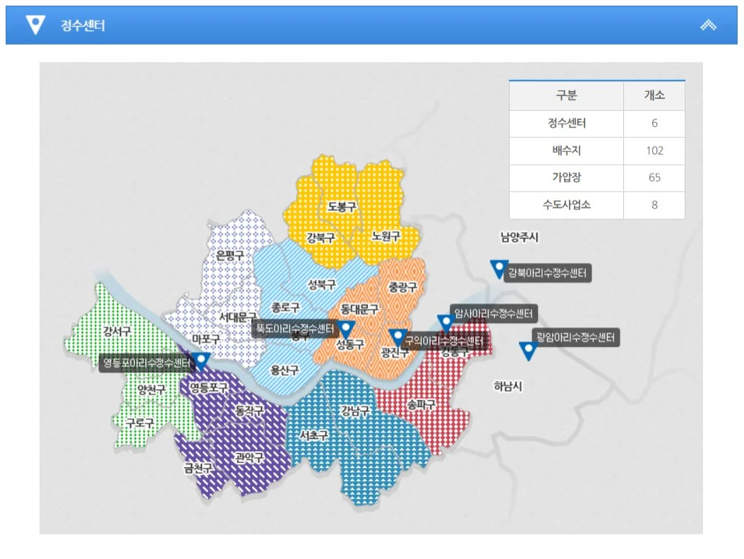 서울 시민의 식수원은 한강(*아리수)이다. 그래서 서울시 내의 정수센터에는 모두 '아리수'라는 단어가 지역 명칭 뒤에 들어가 있다. 현재 서울에는 총 여섯(6) 군데의 수도물 정수센터가 있다.