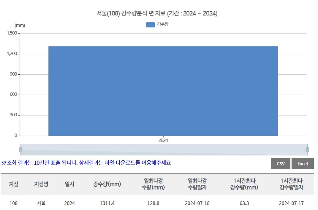 서울(108) 강수량 분석 2024년(1월-12월) 자료, 기상청 기상자료개방포털,