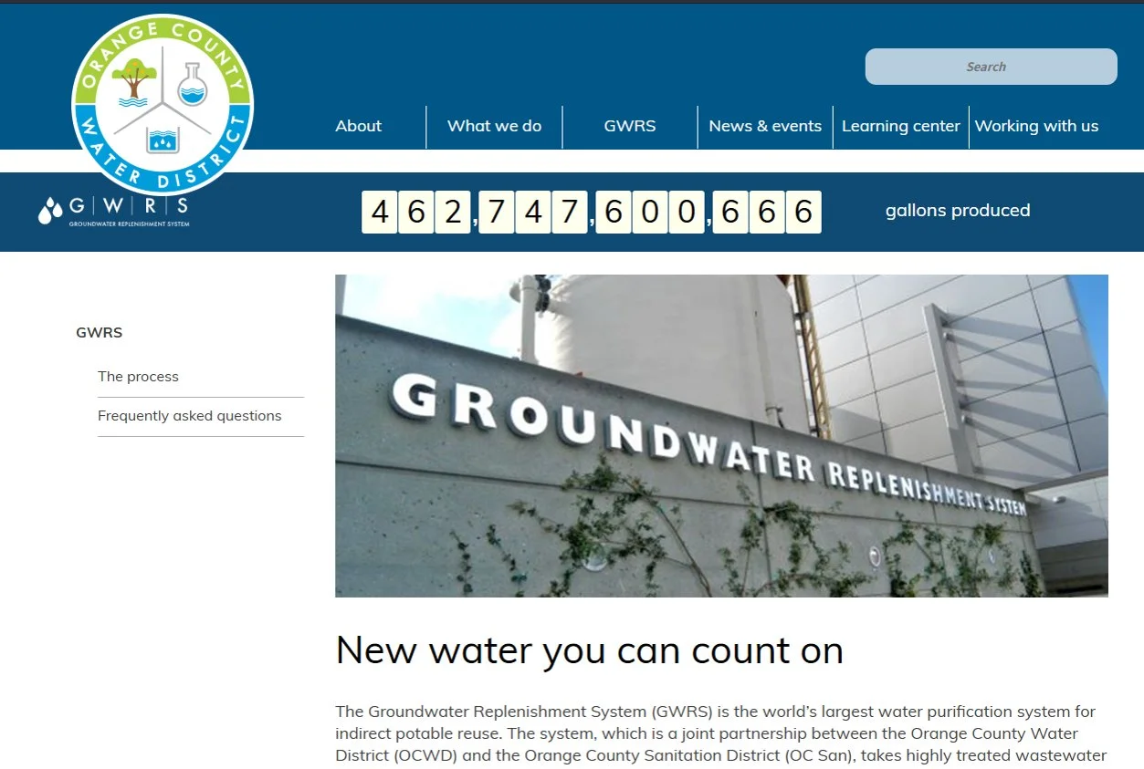 2024년 기준으로 '인구 약 317만 명'이 살고 있는 오렌지 카운티에 지난 2023년에 최종 완공되어 운영 중인 세계 최대의 "지하수 보충 시스템(The Groundwater Replenishment System)"이라는 시설이 있다.