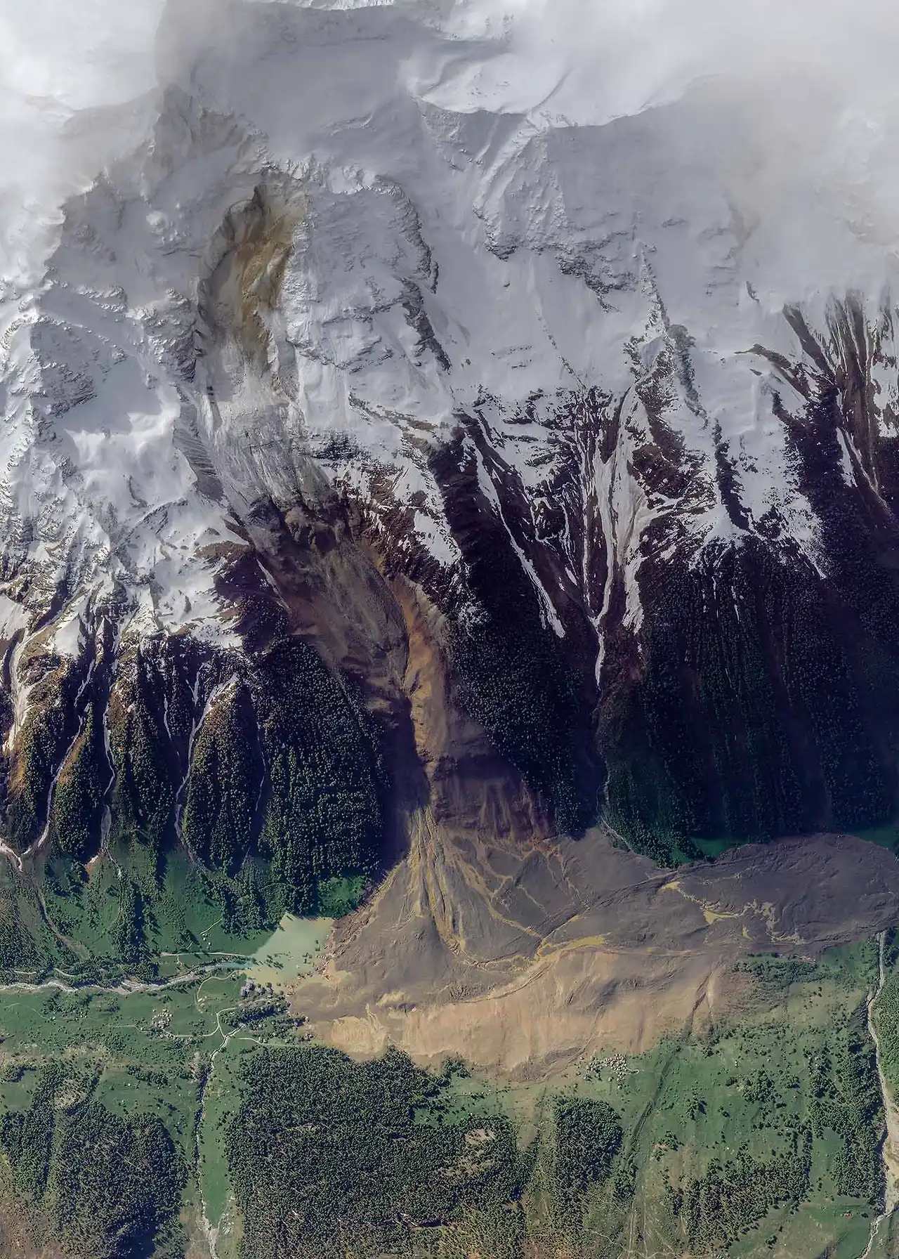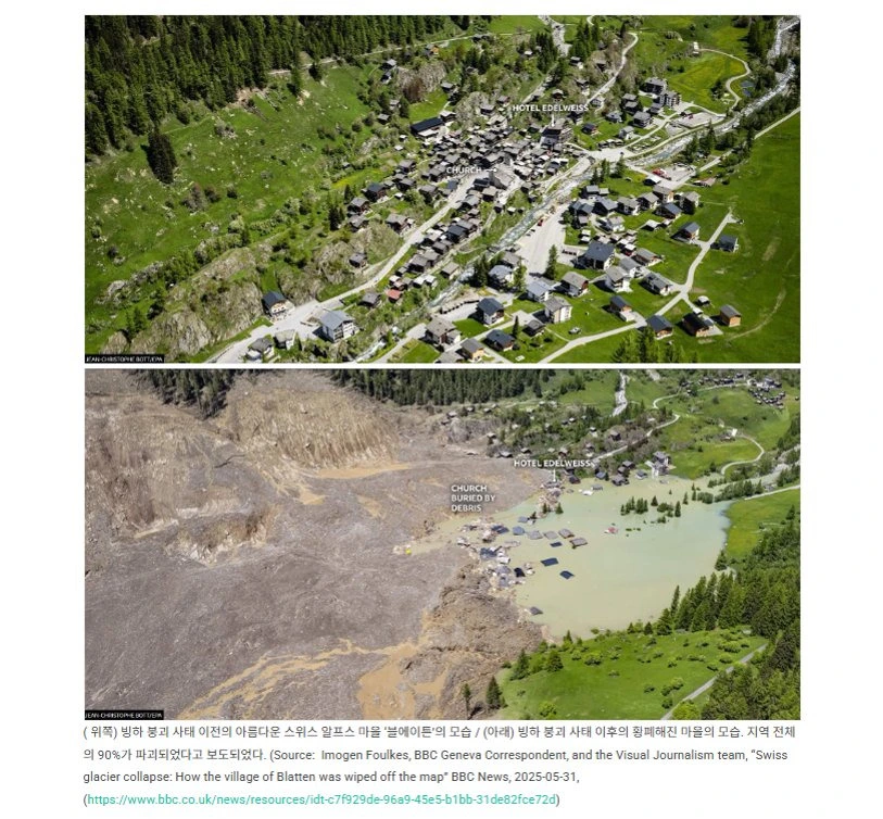스위스 알프스 마을 '블에이튼'에 빙하가 무너져 내린 사태 직후 2025년 5월 30일에 촬영한 사진 (Source: Imogen Foulkes, BBC Geneva Correspondent, and the Visual Journalism team, "Swiss glacier collapse: How the village of Blatten was wiped off the map" BBC News, 2025-05-31)