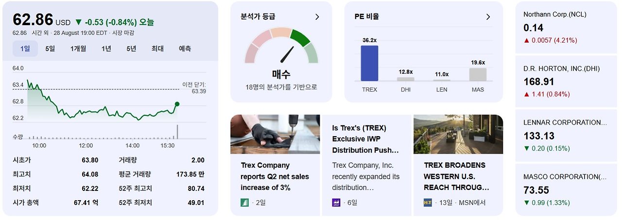 2025년 8월 현재, 뉴욕증권거래소(NYSE)에서 거래되고 있는 합성데크 기업 트렉스(Trex Company, Inc.)의 시가총액은 약 67억 ~ 68억 달러 수준이다. 우리 돈으로 약 9조 2,936억 원 ~ 9조 4,325억 원 규모이다.