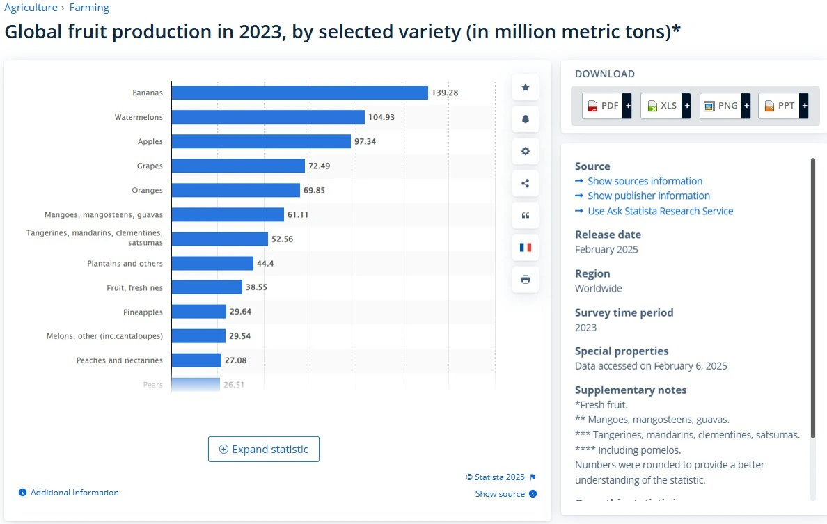 Statista, 'Global fruit production volume 2023, by selected variety', Statista Research Department, Jun 13, 2025