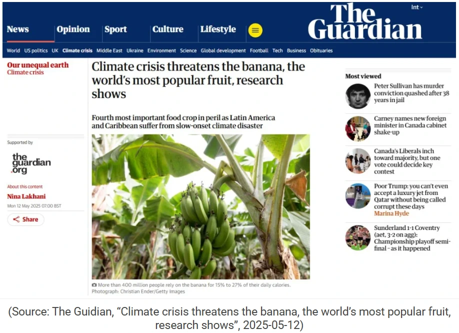 기후변화의 영향으로 식사 대용과 간식으로 자주 먹는 바나나가 생산(재배) 위기에 처해 있다고, 영국 일간지 가디언이 2025년 5월 12일에 보도하였다. 바나나는 세계에서 가장 많이 소비되는 과일이다. 소비량 순위에서도 밀(1위), 쌀(2위), 옥수수(3위)에 이어 세계에서 네 번째로 중요한 식량 작물이다.